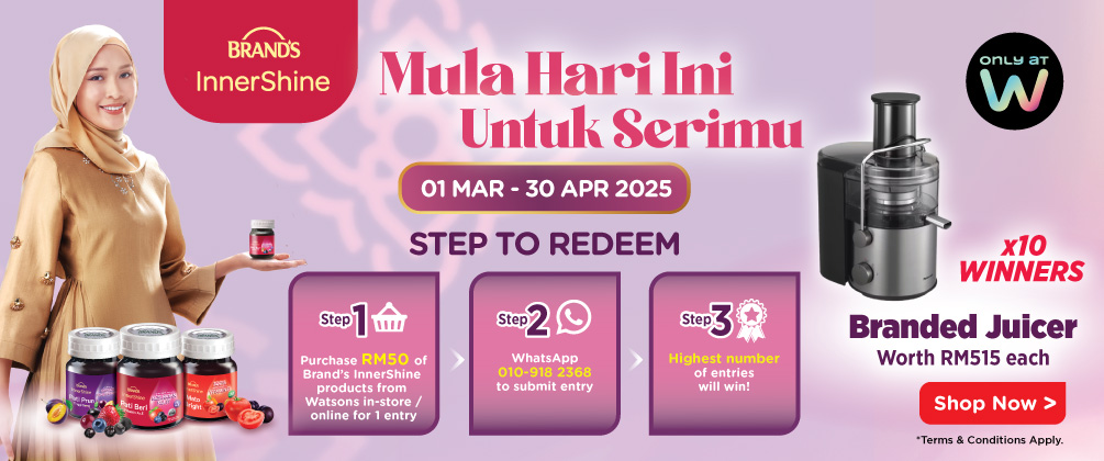 - Participants must purchase BRAND’S® Innershine® worth RM50 and above from any Watsons physical store or Watsons online store during the Campaign Period.